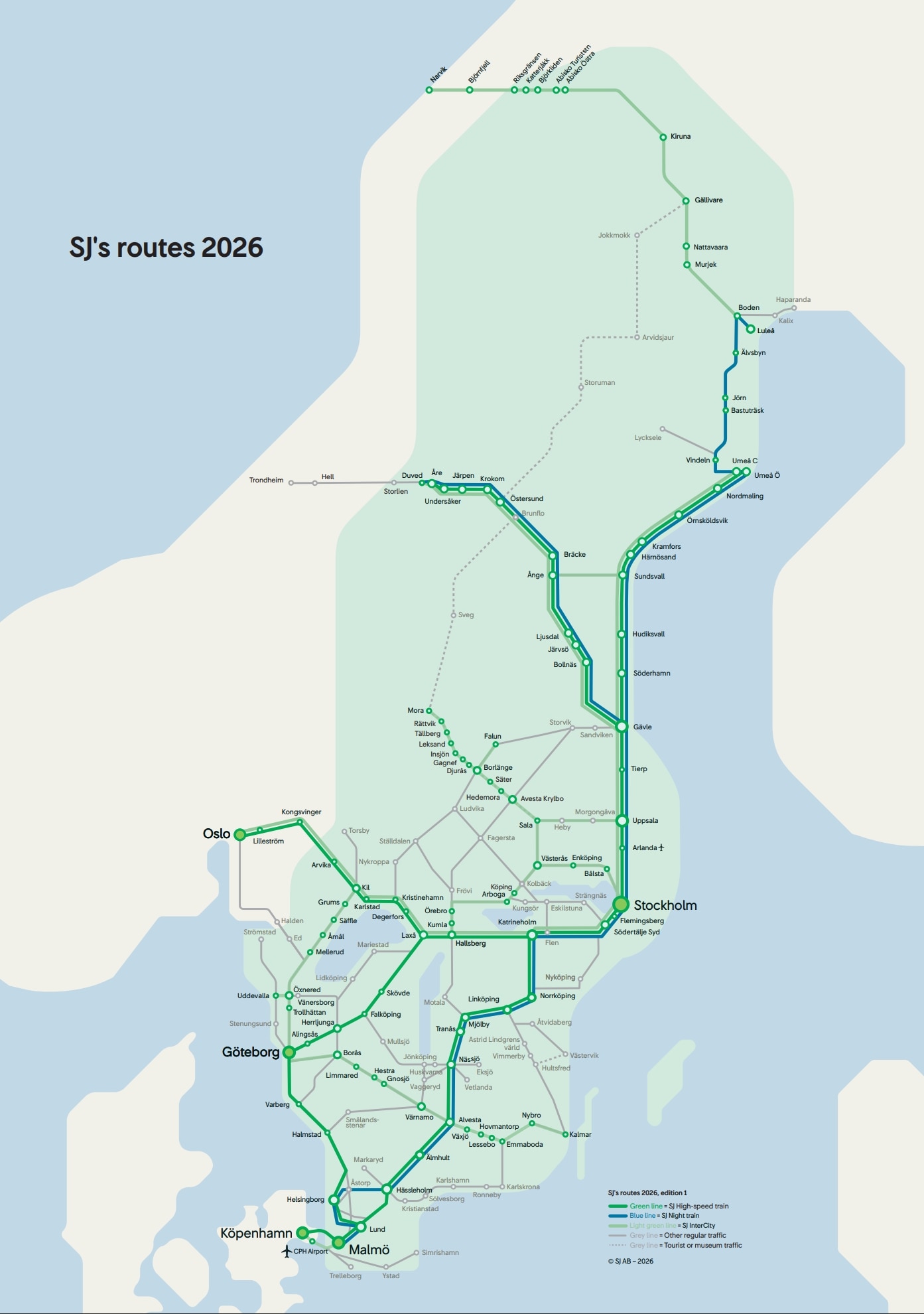 - Reisen Sie außerdem über Nacht von Stockholm bis zum nördlichen Polarkreis nach Narvik (Norwegen) sowie unter anderem nach Luleå, Kiruna und Malmö.