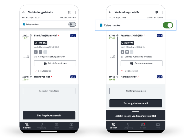 Wenn Sie sich eine Verbindung auch ohne Ticketbuchung speichern möchten, dann aktivieren Sie „Reise merken“ in den Verbindungsdetails Ihrer gewählten Reise. Sind Sie nicht mit Ihrem DB Kundenkonto eingeloggt, dann erhalten Sie zu Ihrer gemerkten Reise die Reisevorschau mit allen wichtigen Informationen zur Fahrt in Echtzeit. Wenn Sie eingeloggt sind, erhalten Sie zusätzlich die Push-Benachrichtigungen bei Fahrplanabweichungen sowie Erinnerungen zur Reise.