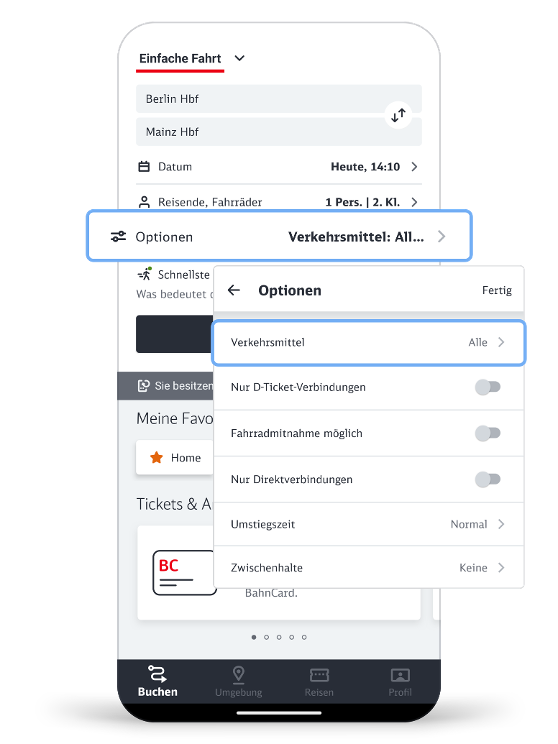 In den „Optionen“ der Verbindungssuche können Sie zusätzlich eingeben, welche Verkehrsmittel Sie bevorzugen, ob beispielsweise Nahverkehr oder nur ICE.