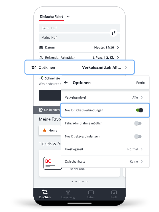 Sie verfügen über ein Deutschland-Ticket? Dann können Sie mit dem Deutschland-Ticket-Filter noch gezielter nach passenden Verbindungen suchen. Einfach den Schieberegler „Nur D-Ticket-Verbindungen" aktivieren. Anschließend werden Ihnen nur Verbindungen angezeigt, auf denen das D-Ticket genutzt werden kann.