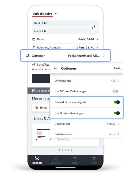 Auch können Sie in den „Optionen“ einstellen, ob die Fahrradmitnahme möglich sein soll oder Sie nur Direktverbindungen angezeigt bekommen möchten.