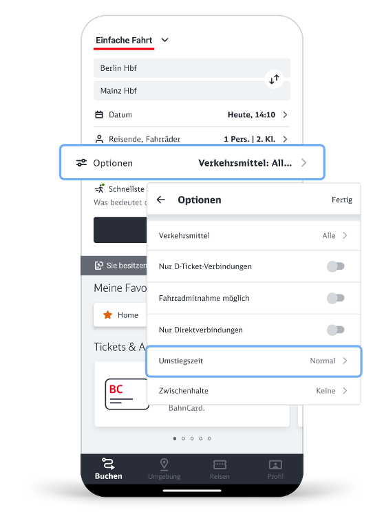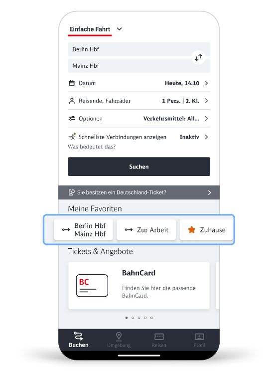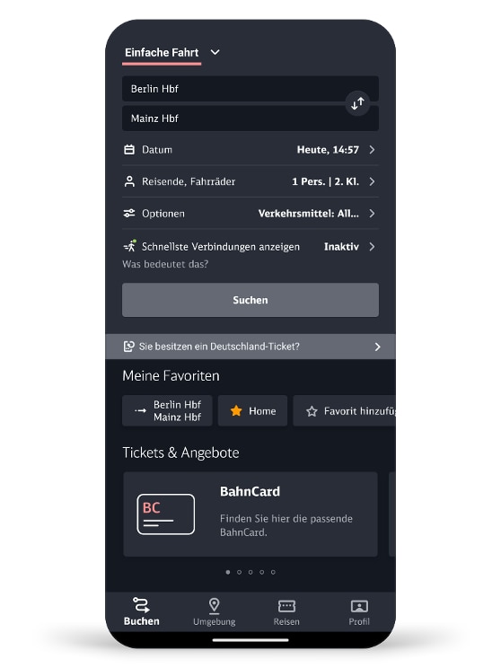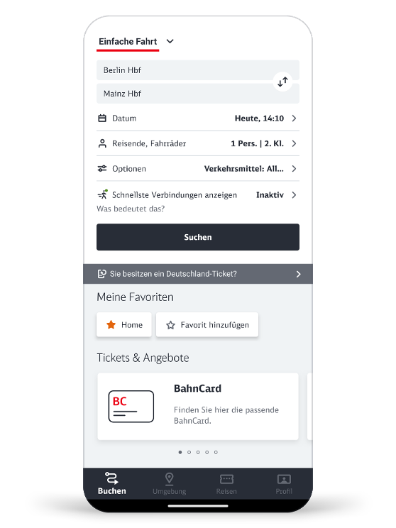Ob für die Reise allein, mit der Familie, in der Gruppe, mit dem Fahrrad oder mit dem Hund - über die optimierte Buchungsstrecke gelangt man einfach und schnell zum passenden Ticket. Entdecken Sie viele praktische Funktionen wie die Reisevorschau, die digitale Reisebegleitung für regelmäßig genutzte Verbindungen und die optimierten Benachrichtigungen zur Reise.