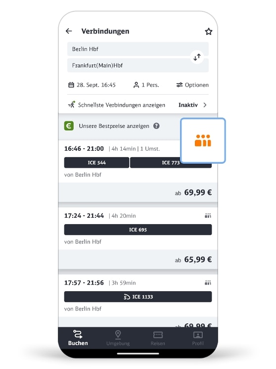 - Auslastungsinformation: Prüfen Sie, wie voll Ihr Zug sein wird.