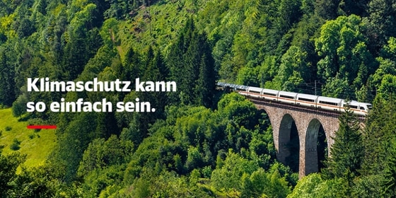 Nachhaltig ans Ziel kommen und verantwortungsbewusst unterwegs sein – genau dafür steht das Reisen mit dem Zug. Zugfahrten sind klimafreundlich und ermöglichen produktive Zeit während der Fahrt. Die ICE-, IC- und EC-Züge fahren seit Anfang 2018 innerhalb Deutschlands sogar mit 100 Prozent Ökostrom und sind damit besonders klimafreundlich unterwegs.