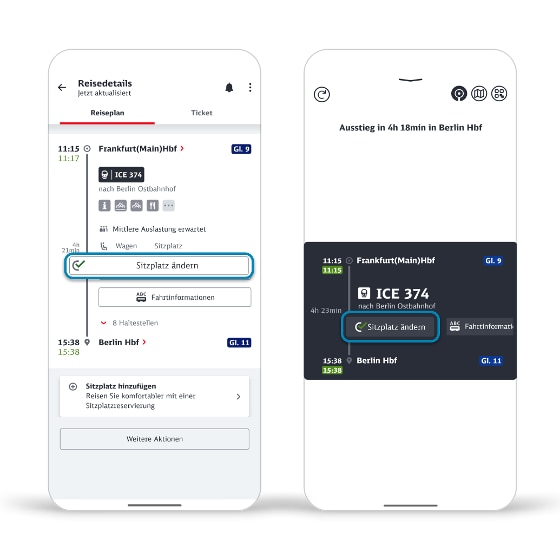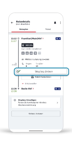 - Bei einem Sitzplatzwechsel nutzen Sie bitte den Button „Sitzplatz ändern“ im Reiseplan, um den sitzplatzgebundenen Check-in zu aktualisieren. Dadurch wird das Zugpersonal über Ihren neuen Sitzplatz informiert und Sie werden auch auf diesem in der Regel nicht mehr kontrolliert.