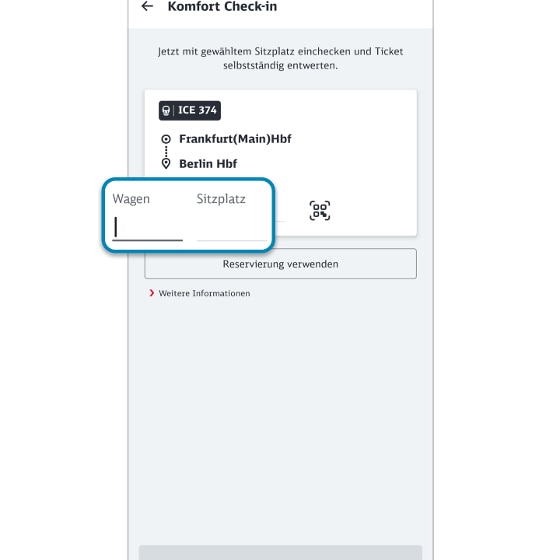 Der Komfort Check-in ist auch mit einer separat gebuchten Reservierung möglich. Klicken Sie hierfür bei der Wagen- und Sitzplatzeingabe auf „Reservierung verwenden“ und wählen die entsprechende Reservierung aus. In bestimmten Situationen müssen Sie durch die Eingabe der Reservierungsnummer (Res. Nr.) Ihre Reservierung erst laden. Sie finden diese Nummer entweder in der Bestätigungsemail oder den Reservierungsinfos (PDF).