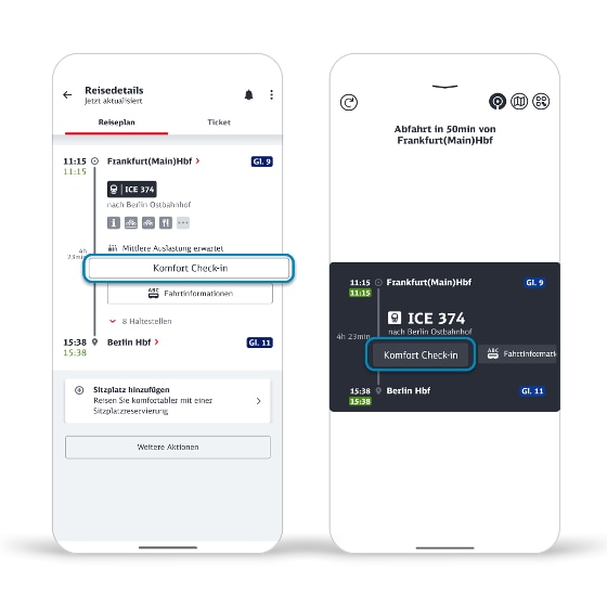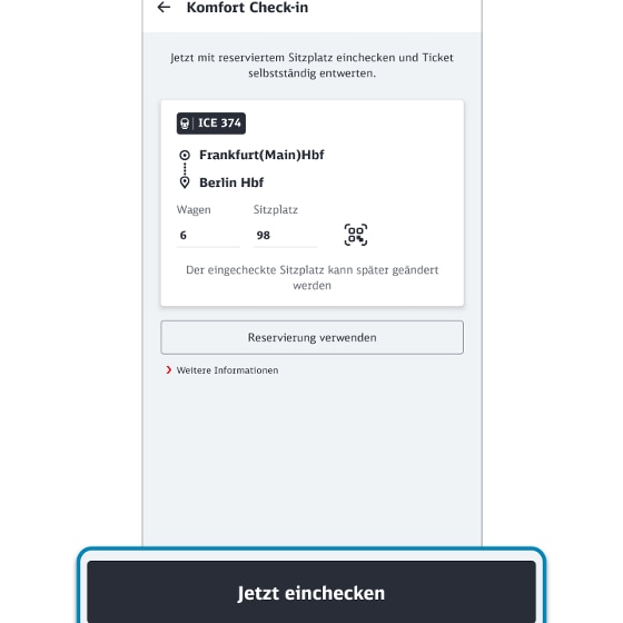 - freigeschaltete Zugverbindung (erkennbar am Zusatz „Komfort Check-in verfügbar - wenn möglich bitte einchecken“ unter weitere Informationen im Reiseplan Ihrer Verbindung)