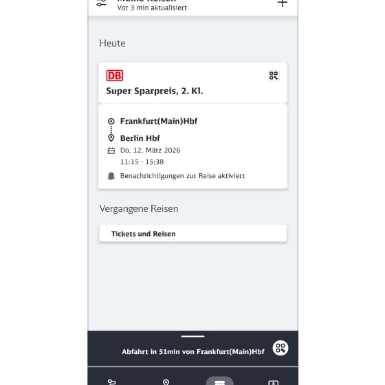 - Öffnen Sie in der DB Navigator App die Kategorie „Reisen“ und wählen Sie Ihr aktuelles Ticket (nicht die ggf. separat gebuchte Reservierung) aus.